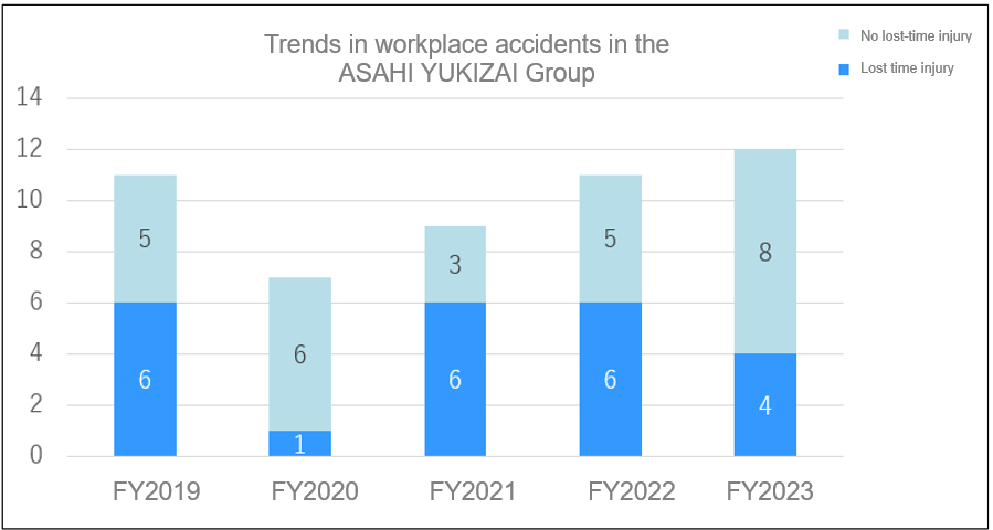 ASAHI YUKIZAI Group, where we work, will prioritize safety in thinking and actions and build a workplace environment where we can work lively in good physical and mental health and with peace of mind.