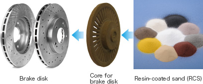 Sand molds, used in the manufacturing process for castings,are made using resin-coated sand(RCS) in which natural sand and artificial aggregates are covered with casting resins. Since we manufacture both RCS and casting resins,we can control the characteristics of both materials; and thereby we are able to realize customer needs on a higher dimension. As a new product, we produces and began to sell "Hexapass®", a new RCS product with low odor and low smoke, began production and sales in 2012.